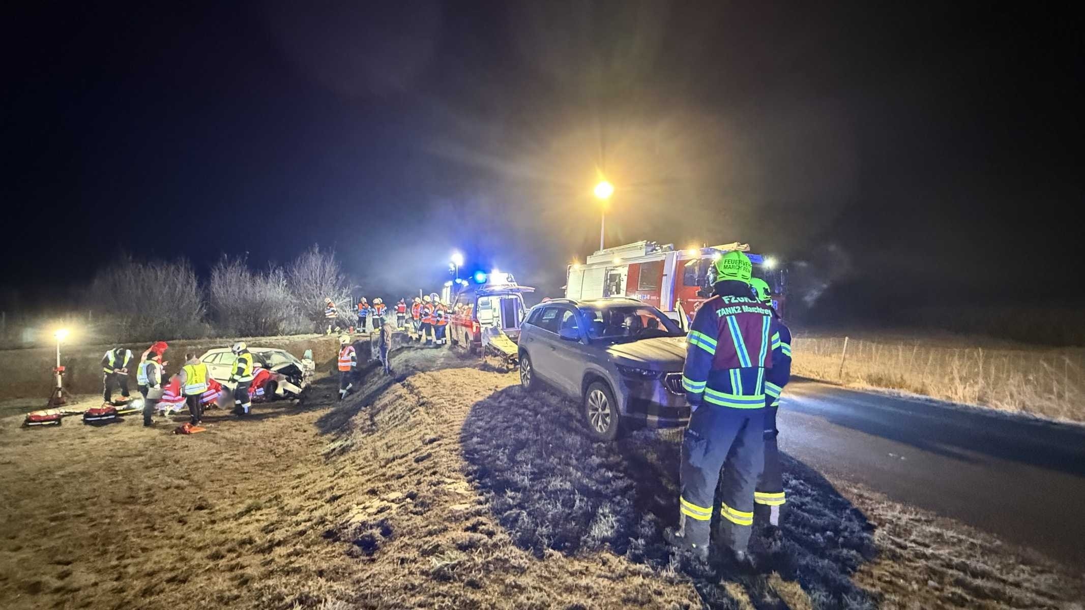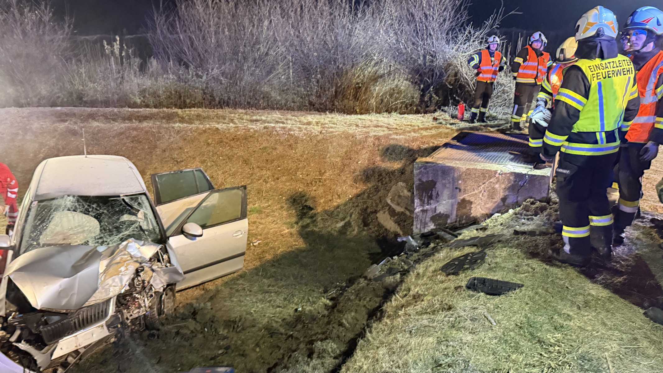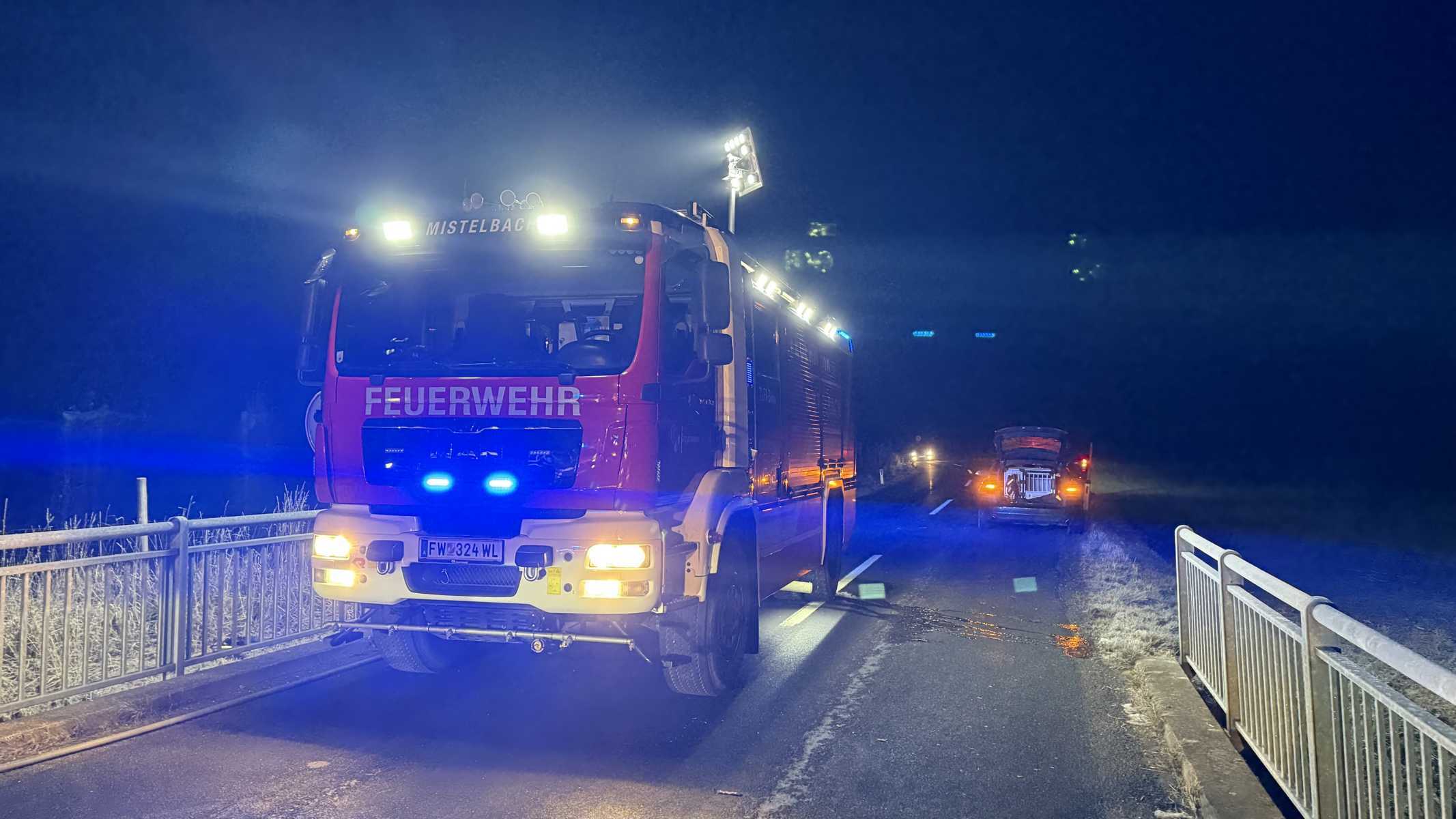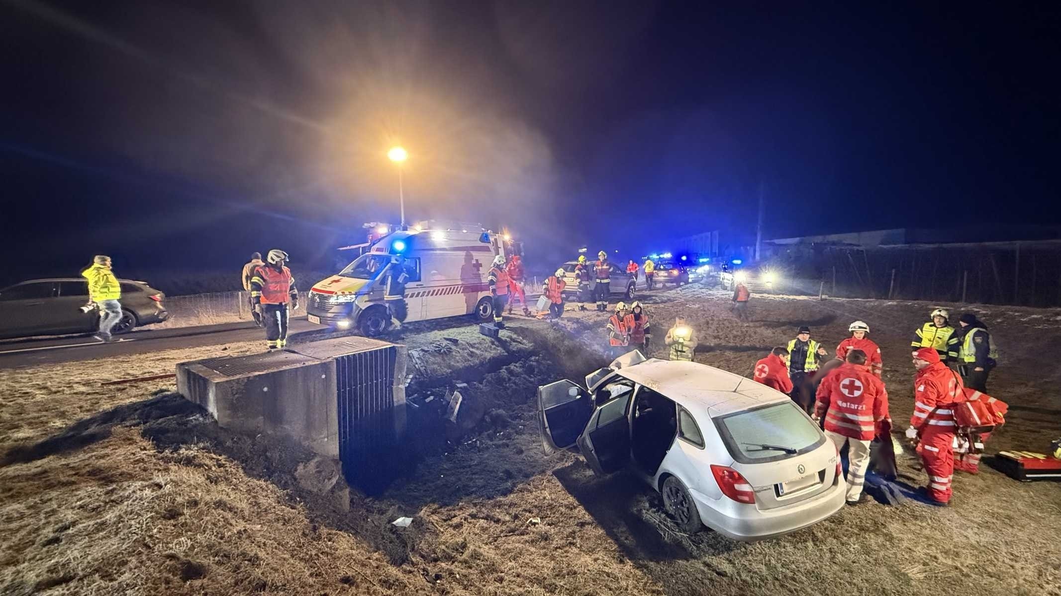 Ein PKW mit zwei Insassen kam auf der Mistelbacher Landesstraße im Bereich einer Kurve von der Fahrbahn ab und prallte gegen einen Betonsockel in einem Regenrückhaltebecken.