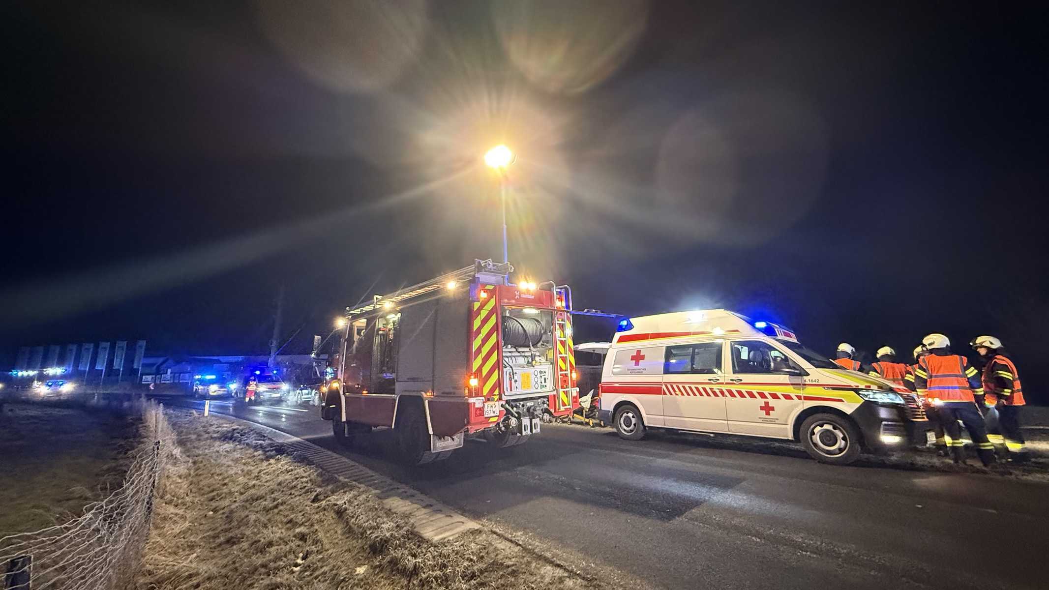 Zwei zum Einsatz kommende Feuerwehrmitglieder kamen auf dem Weg zum Feuerwehrhaus an der Einsatzstelle vorbei und konnten dem eintreffenden Einsatzleiter bereits ein Lagebild geben. Entgegen der ersten Meldung war keiner der Insassen mehr im Fahrzeug eingeklemmt. Beide Fahrzeuglenker waren jedoch mittel bis schwer verletzt und nach der Versorgung durch den Rettungsdienst in die umliegenden Krankenhäuser eingeliefert. Als erste Maßnahmen wurden ein 2-facher Brandschutz aufgebaut sowie die Batterie des Fahrzeugs abgeklemmt. Ebenso wurde die Straße durch Feuerwehrmitglieder gesperrt und der Verkehr umgeleitet.